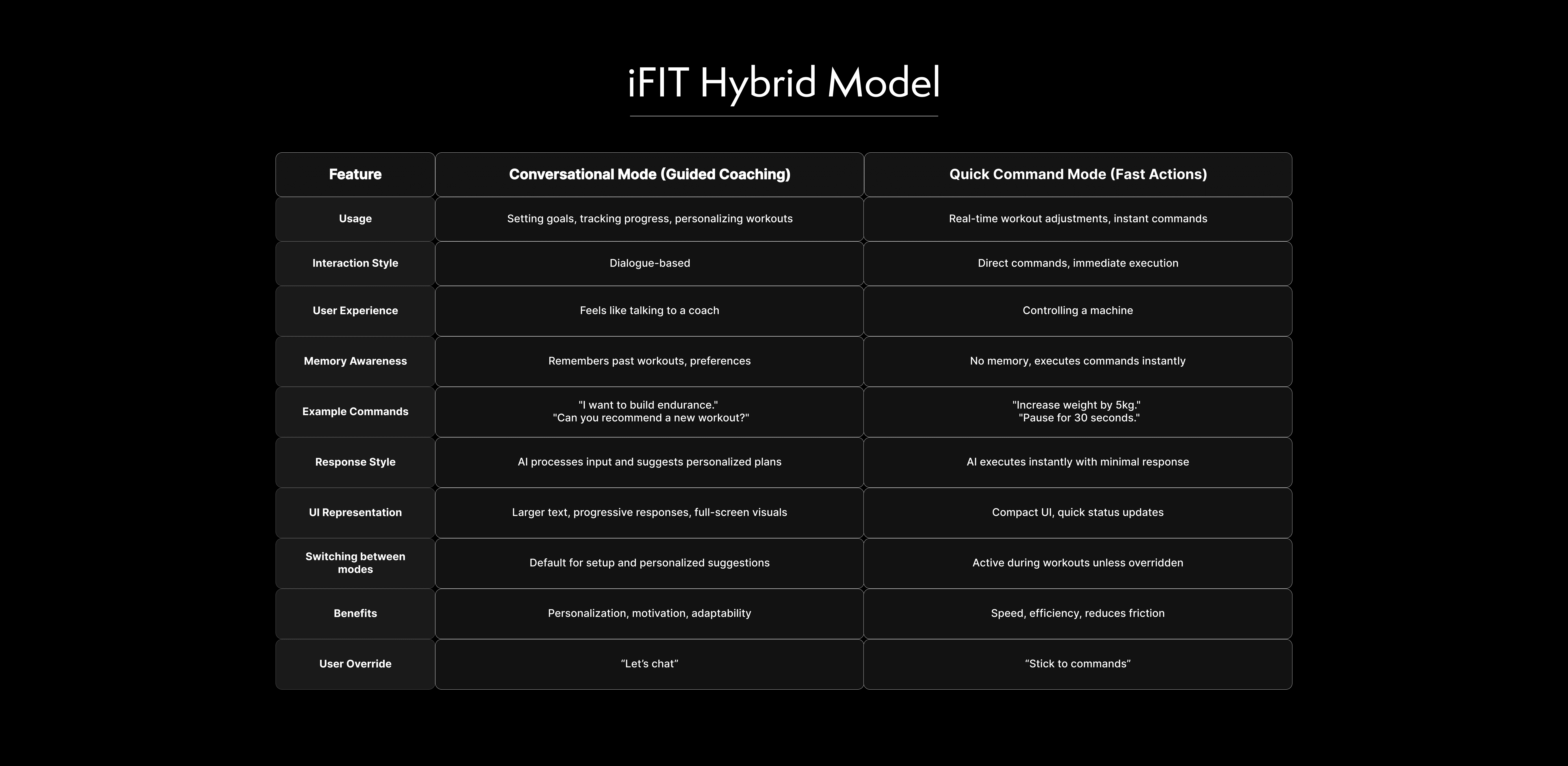 One of my primary contributions was developing the voice interaction model—defining how conversational AI should behave during workouts.
