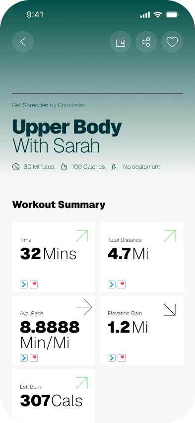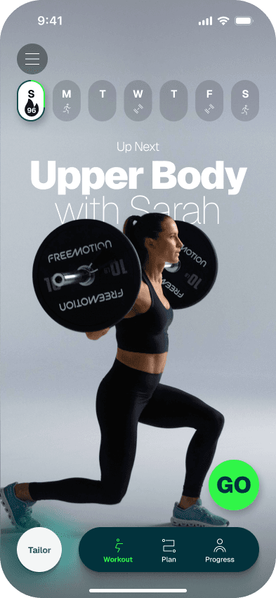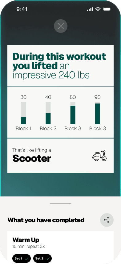 An AMRAP challenge at the end of each workout, matched to your goal. Progression tracking makes self-assessment fun, not clinical.
