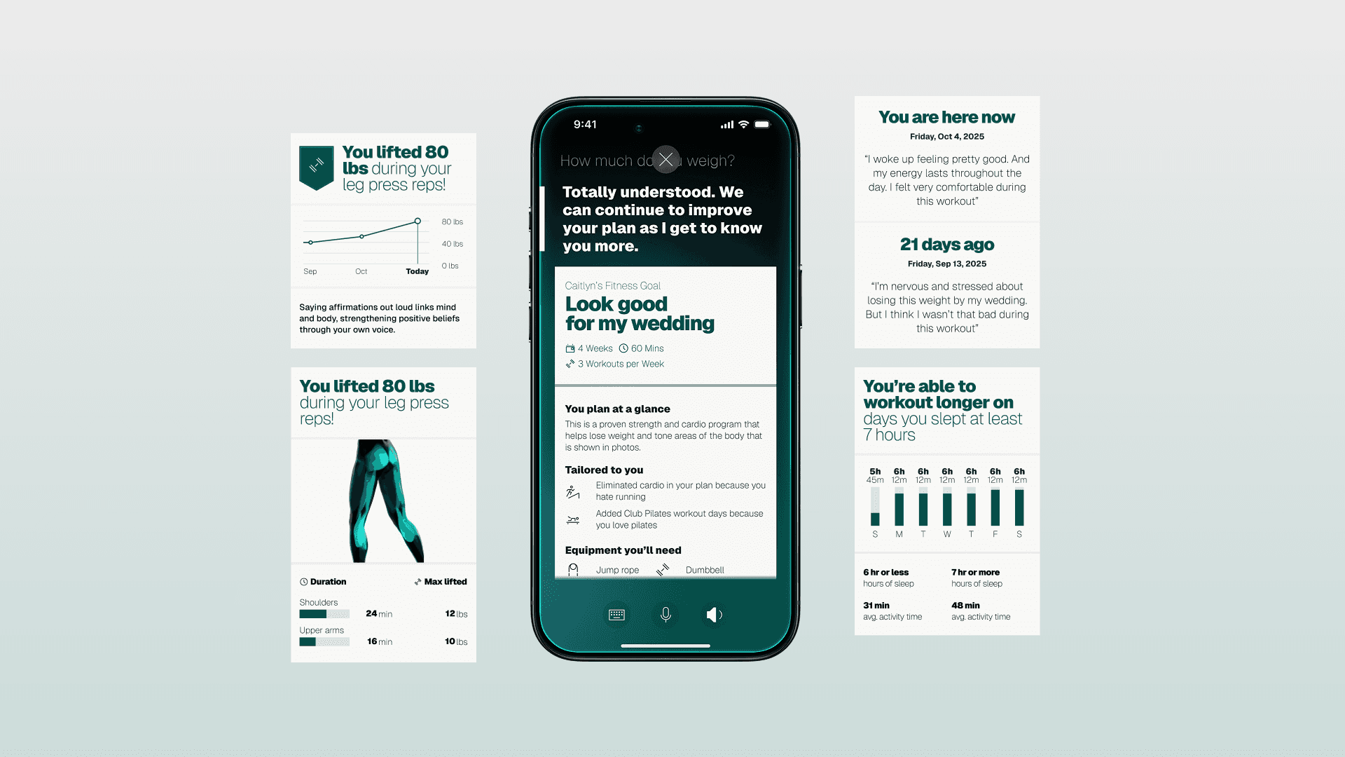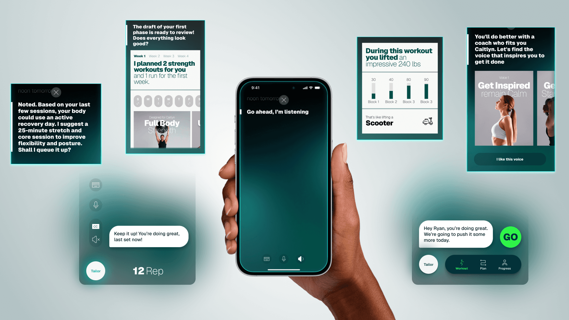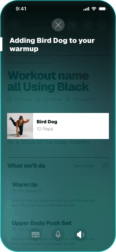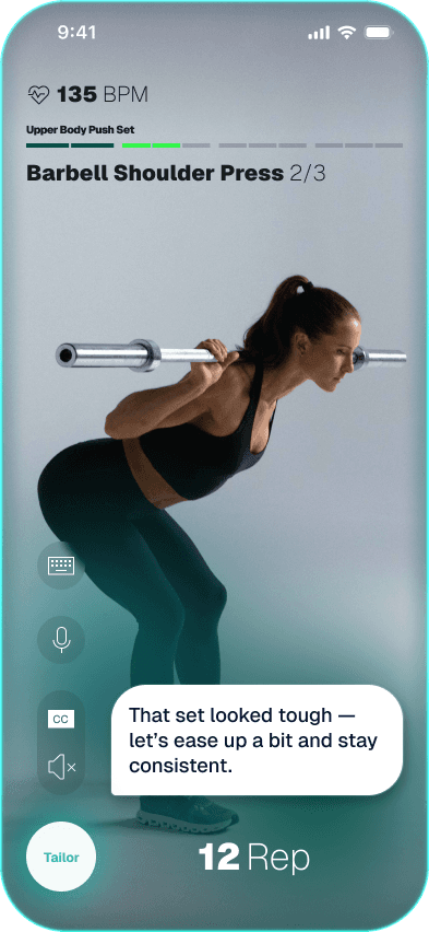 Tailor isn't a screen you go to. It's the voice that runs through everything — goal-setting, plan building, pre-workout adjustments, mid-session coaching, rescheduling, and the nudges that bring you back. You can speak or type. It listens, responds, and adapts.