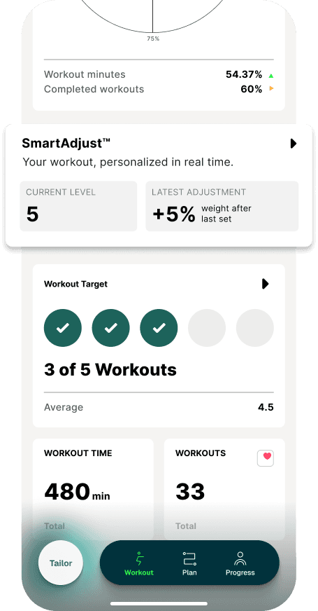 A persistent SmartAdjust level that progresses over time, with latest adjustments and workout targets.