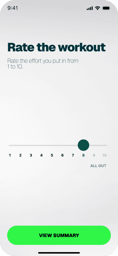 Post-workout exertion rating on a 1–10 scale, feeding directly into future recommendations.