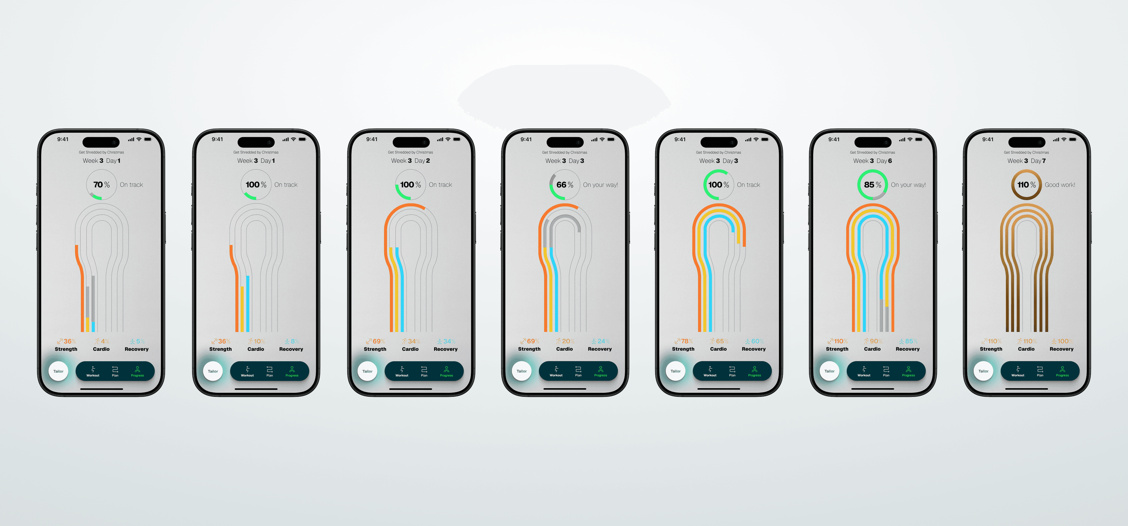 We designed a holistic progress system with up to 4 tracks — Strength, Cardio, Recovery, and Fuel — each with weekly targets that roll up into a unified view.