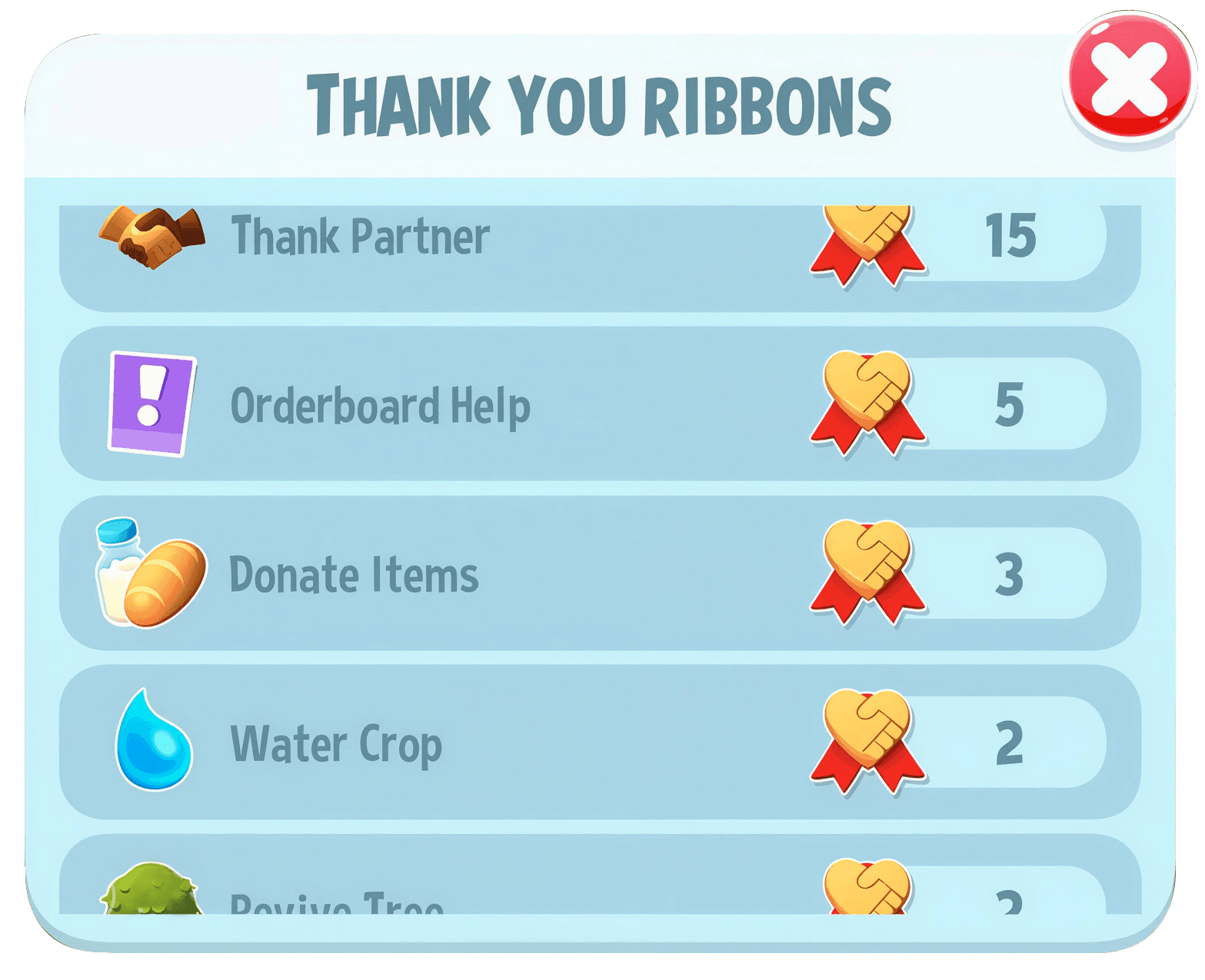 A tree placed directly on the player’s farm that decorates as they help others. Ribbons turn invisible acts of help into visible progress.