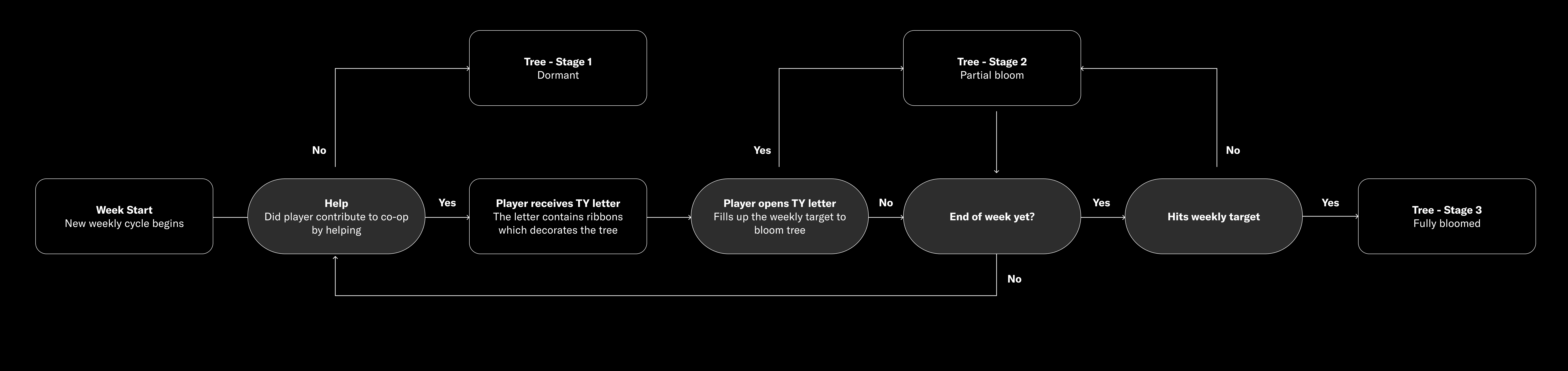 Released in November 2023, the Thank You Tree became a permanent co-op feature built on one simple loop:
